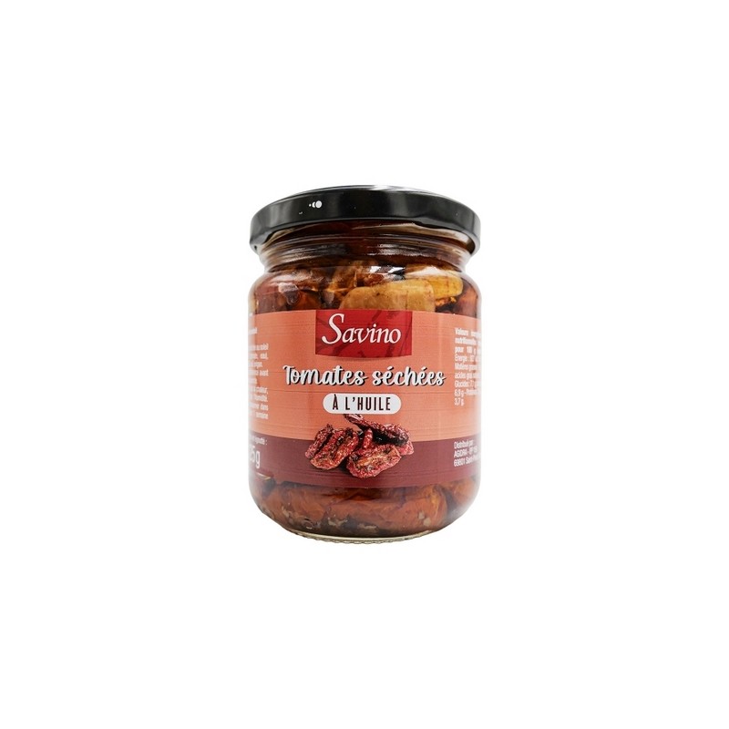 Återfuktade soltorkade tomater 61,7% (tomater, vatten), rapsolja 37,5%, vitlök, oregano.