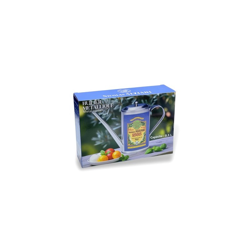 Plåtkanna till olivolja ifrån Alziari, Nice.